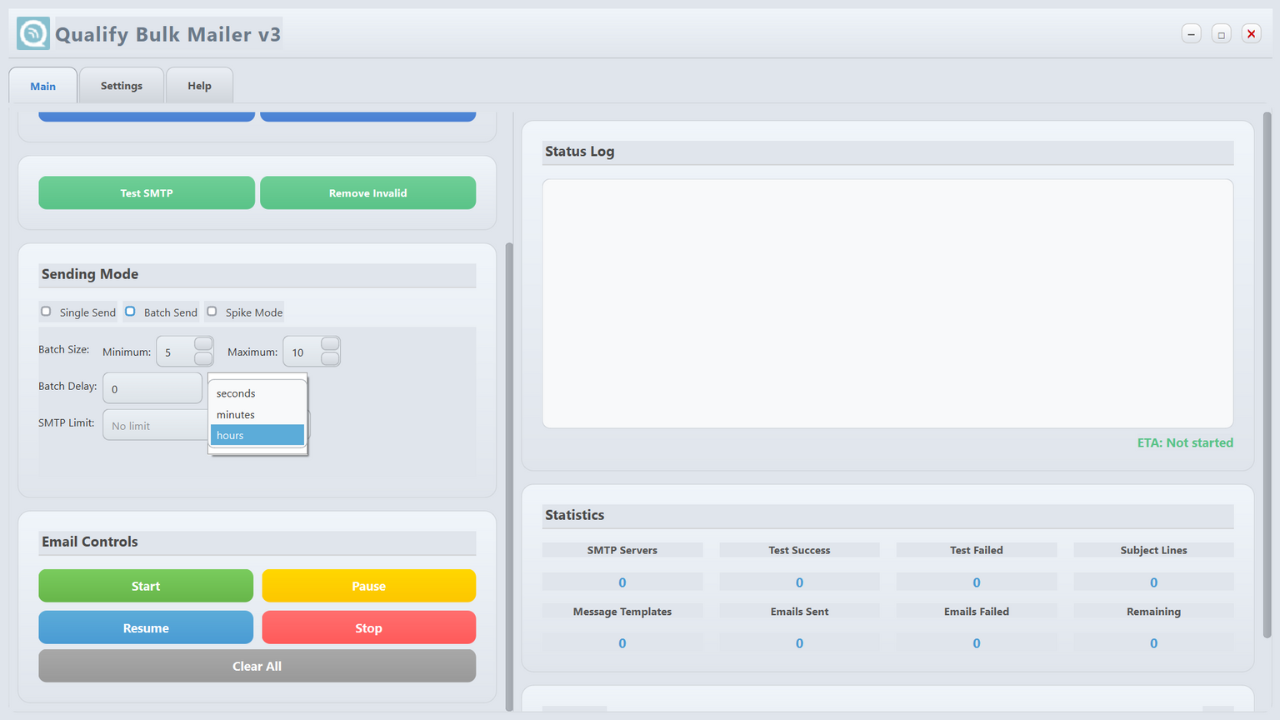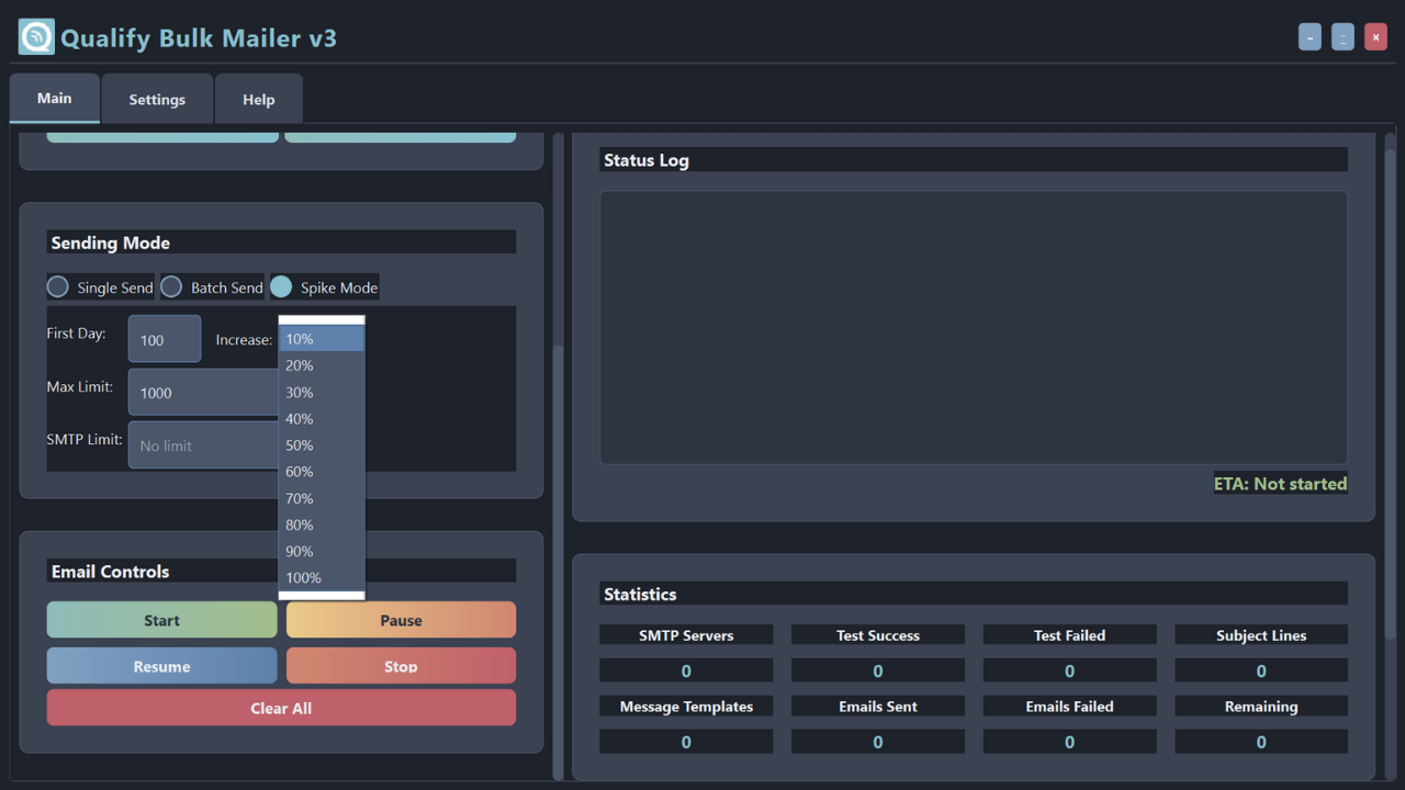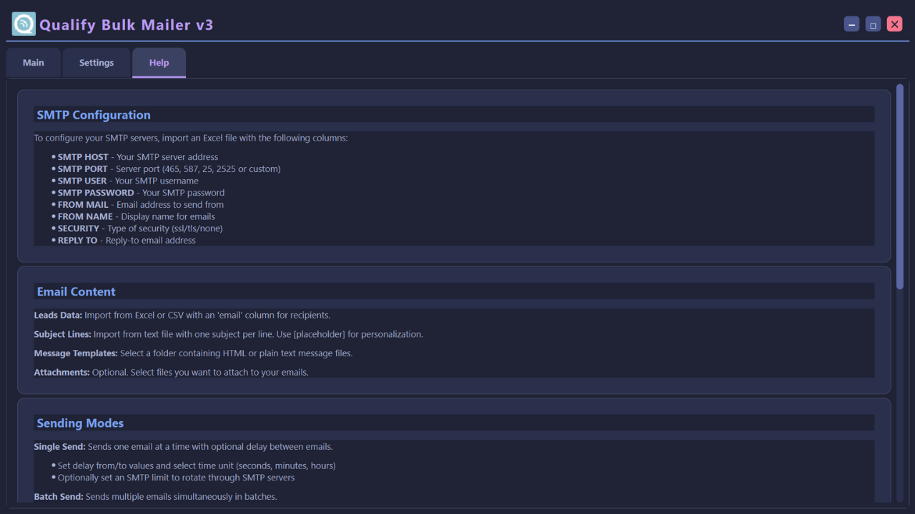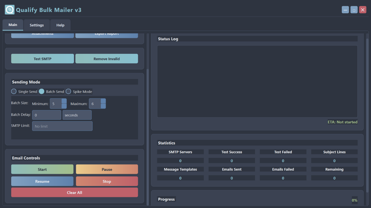 يتيح لك البرنامج إضافة عدد غير محدود من حسابات SMTP من مزودين مثل Gmail وOutlook وYahoo، بالإضافة إلى أي خادم SMTP مخصص، ثم يقوم تلقائيًا بالتحقق من صحة الخوادم وإزالة الخوادم غير العاملة للحفاظ على نظافة قائمة الإرسال. يعمل نظام مدمج للتهيئة والتحكم في معدل الإرسال على زيادة حجم الرسائل تدريجيًا، وتطبيق حدود مخصصة لكل خادم SMTP، وإضافة فواصل زمنية قابلة للتعديل بين الرسائل، بحيث يبدو سلوك الإرسال طبيعيًا لمزودي خدمة الإنترنت وفلاتر البريد العشوائي. يضمن التناوب التلقائي بين خوادم SMTP والمواضيع ومحتوى الرسائل أن تكون كل رسالة بريد إلكتروني مختلفة قليلاً، مما يعزز إمكانية وصول الرسائل ويقلل من خطر تصنيف الحملات الجماعية كرسائل غير مرغوب فيها.