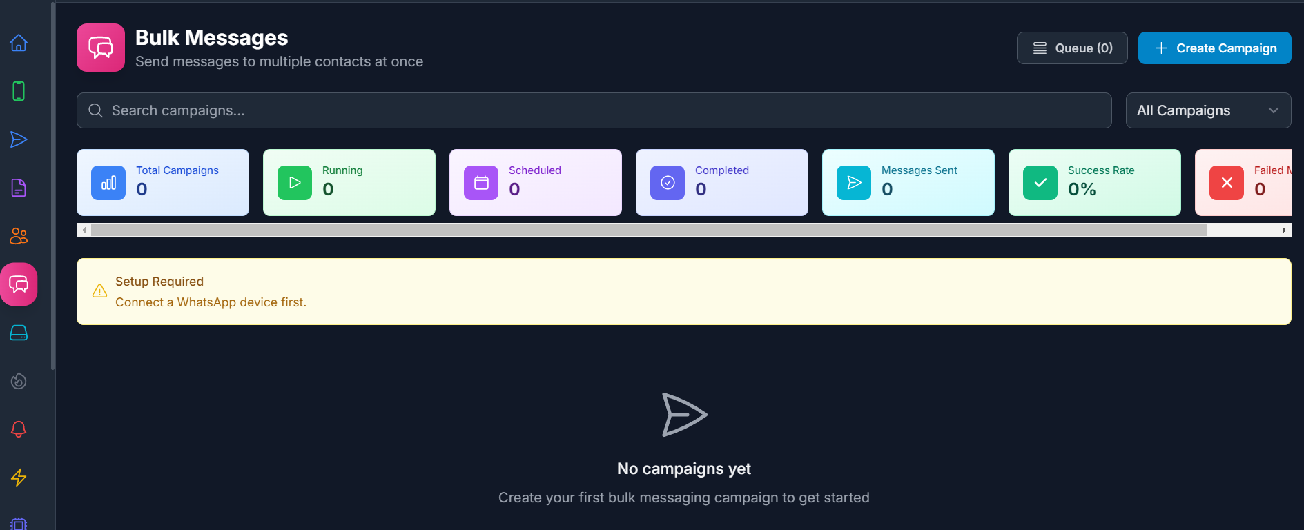 - Bulk Messaging & Campaigns: Schedule large-scale campaigns with dynamic personalization and delivery tracking.