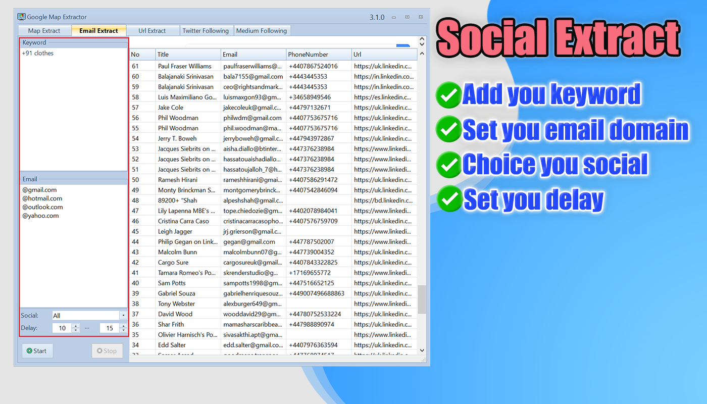 -- Added: Social Email Extractor support (LinkedIn, Facebook, Instagram, YouTube) -- Fixed: Extraction stability issue during long sessions -- Improved: Performance of social network data parsing