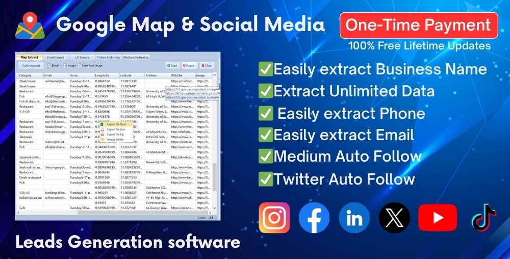 Introducing Google Map & Social Media Leads Generation Software – the comprehensive system engineered to provide you with unlimited access to verified, real-time contact data from the two richest sources of business and consumer intelligence: Google Maps and major Social Media Platforms.