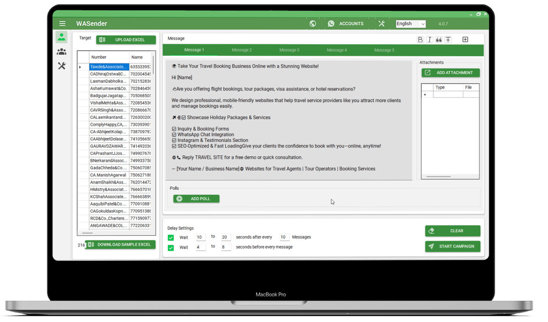 Send personalized messages to thousands of contacts, groups, or unsaved numbers with a single click, using Excel and CSV imports to upload contact lists in seconds. Every message can be customized with recipient names, cities, business types, or any custom field, making each conversation feel one-to-one instead of a mass broadcast. Attach images, videos, documents, audio files, and captions to boost engagement and build trust with your audience.